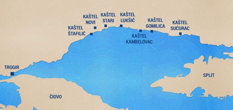 Kaštela su naziv za sedam manjih spojenih mjesta uz obalu Kaštelanskog zaljeva. To su: Štafilić, Novi, Stari, Lukšić, Kambelovac, Gomilica i Sućurac. Svako ovo mjesto, smješteno oko svoje utvrde odnosno kastela, nosi svoju osebujnu povijesnu priču i odiše ljepotom prirode i tradicije mediteranskog podneblja...