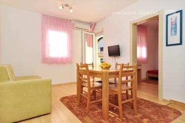 Kuća se nalazi u Kaštel Starom, samo 60 metara je udaljena od najbliže plaže. Apartman se nalazi na prvome katu i sastoji se od dvije spavaće sobe, jedna s bračnim krevetom a druga sa krevetom za jednu osobu, kuhinje s dnevnim boravkom, gdje je kauč na razvlačenje i kupatila. Apartman ima balkon.
